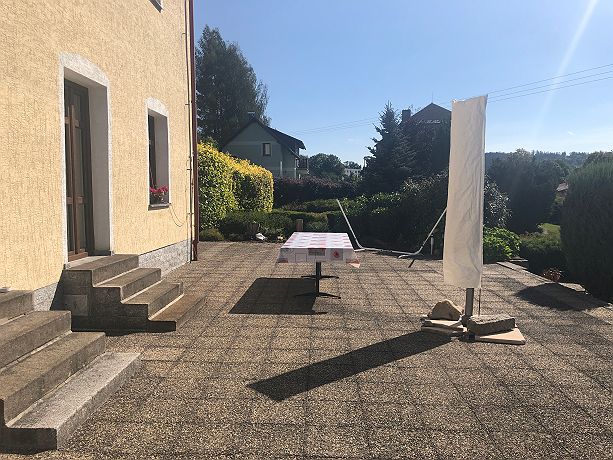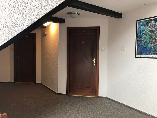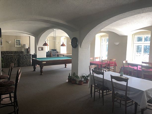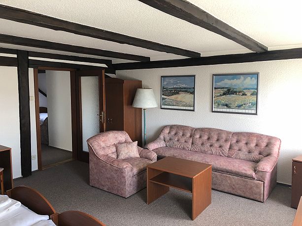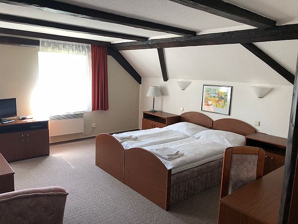 Čtyřlůžkový apartmán s oddělenými postelemi a rozkládací pohovkou, celkem tedy až pro 6 osob. Nachází se v podkroví s výhledem do zahrady. Má vlastní koupelnu s WC a sprchovým koutem. V pokoji je psací stůl, lednice, televize se satelitními programy a WIFI zdarma. Dále jsou k dispozici velké společné prostory v přízemí s posezením, malou kychyňkou a terasou s venkovním grilem. K dispozici je kávovar, minibar s pitím (za poplatek) a veškeré potřebné nádobí. K ukrácení chvíle je možno využít velký kulečník a šipky.