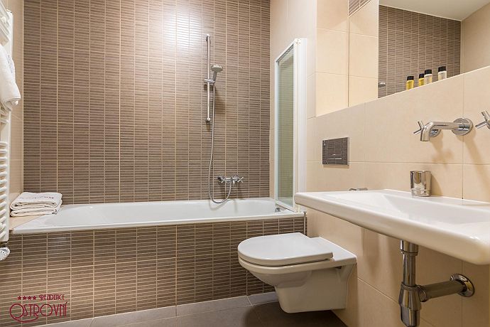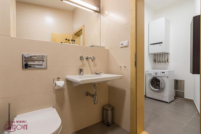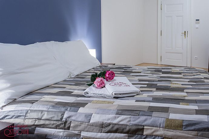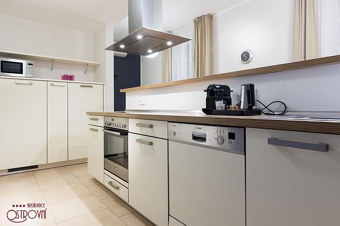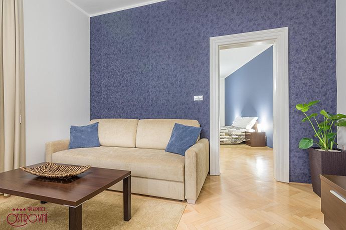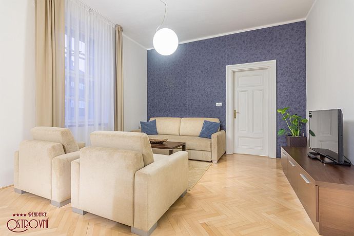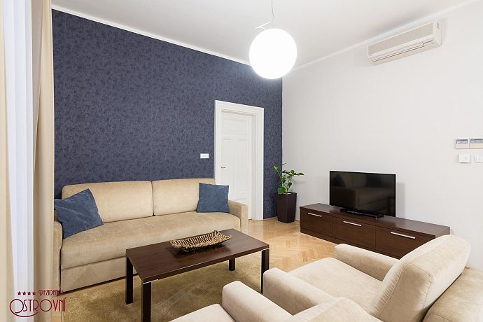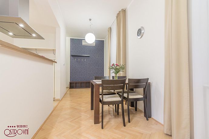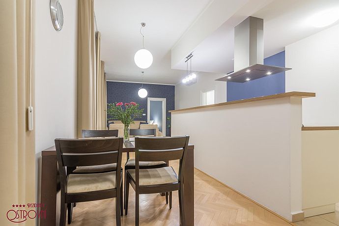 Apartment No.6 combining elegance and timeless design. This apartment has 83 sqm. All apartments represent a suitable place for spending a family holiday in one of the most beautiful European capitals as well as for creating a temporary home if staying longer. Having only 10 apartments in the building ensures maximum privacy. For the comfort of guests all apartments are fully equipped: Wi-Fi internet, SAT TV, LCD TV, air condition, kitchen unit with dishes and Bosch appliances (refrigerator with freezer, glass ceramic hob, oven, dish washer, microwave, kettle, Nespresso coffee maker), bathroom with bath and glass curtain, washing machine, safe, iron, ironing board, hair-dryer, bed and bath linens, house phone. Residence Ostrovni is guarded by a camera surveillance system. All interior premises are non-smoking. The rental price includes the following services: All equipment, Wi-fi, SAT TV, bed and bath-linen exchange in case of minimum 7 nights stay, technical maintenance. Residence Ostrovni is favorite not only for its excellent position, but also thanks to family atmosphere and art of hospitality.