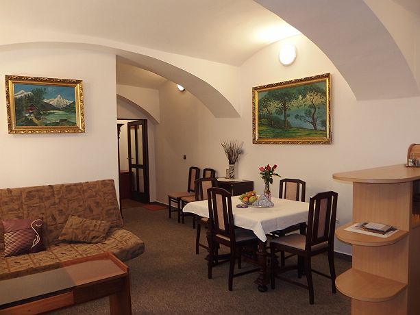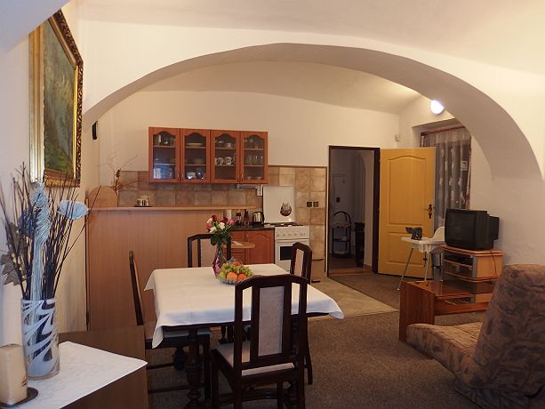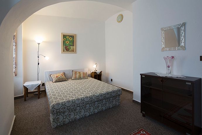 Krásné a prostorné apartmá se stylovým nábytkem a klenutým stropem. Ideální pro rodiny s dětmi, pohodlný pro 5 hostů. Rozloha apartmánu je 55 m2, jeho kapacita 5 osob (manželská postel v ložnici, rozkládací pohovka v obývací části + možnost jednolůžka - historická postel). Apartmán má samostatný vchod, vlastní kuchyňku a sociální zařízení. Naše Apartmány U koček se nacházejí 10 minut chůze od centra města, na břehu řeky Lužnice, u cyklostezky a přímo u Granátové skály, pod Kotnovem. Parkování možné přímo u domu nebo na parkovišti za řekou (cca 50m). K dispozici Vám je wifi v celém objektu, venkovní bazén, terasa s posezením a nově také půjčujeme jízdní kola (za dobrovolný poplatek a v běžném opotřebení). Nenabízíme klasické snídaně, ale zajistíme pro Vás pestrou nabídku potravin (od pečiva a muesli, přes salámy, sýry po jogurty,ovoce a zeleninu) a nápojů (čaj, káva, mléko, džus). Sami si tak určíte jak složení, tak i čas Vaší snídaně.