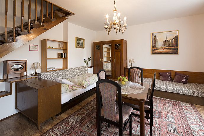 Útulný apartmán ideální pro 2-3 hosty. Obývacímu pokoji dominuje dřevěné schodiště, od něhož vznikl název apartmánu. Rozloha apartmánu je 40m2, jeho kapacita jsou 3 osoby (rozkládací pohovka a jednolůžko). Možnost rozšíření apartmánu o podkroví (až 6 osob). V případě zájmu nás kontaktujte a sdělíme Vám detaily. Naše Apartmány U koček se nacházejí 10 minut chůze od centra města, na břehu řeky Lužnice, u cyklostezky a přímo u Granátové skály, pod Kotnovem. Parkování možné přímo u domu nebo na parkovišti za řekou (cca 50m). K dispozici Vám je wifi v celém objektu, venkovní bazén, terasa s posezením a nově také půjčujeme jízdní kola (za dobrovolný poplatek a v běžném opotřebení). Nenabízíme klasické snídaně, ale zajistíme pro Vás pestrou nabídku potravin (od pečiva a muesli, přes salámy, sýry po jogurty,ovoce a zeleninu) a nápojů (čaj, káva, mléko, džus). Sami si tak určíte jak složení, tak i čas Vaší snídaně.