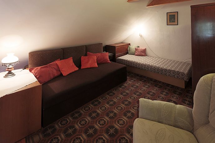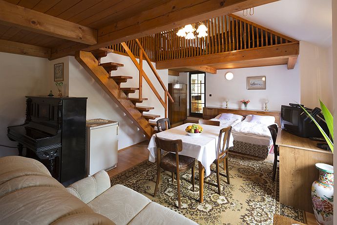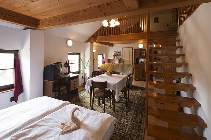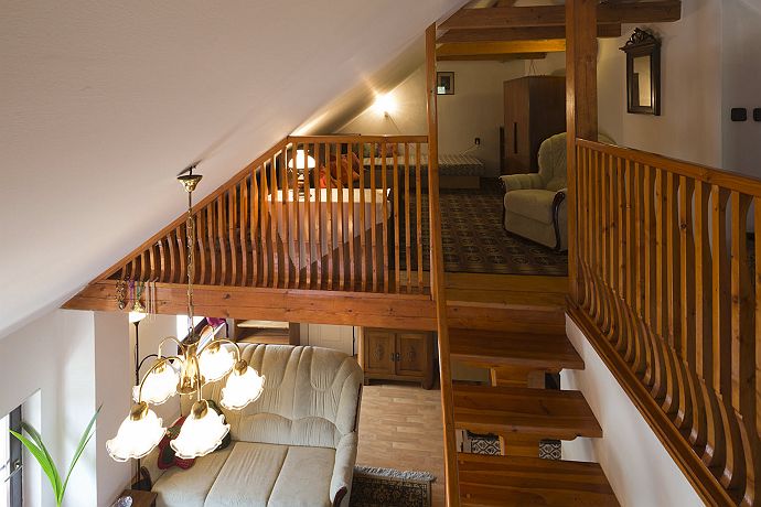 Náš největší apartmán. Vhodný pro skupinu kamarádů nebo rodinu, pohodlný pro 6 osob. Hlavní dekorativní prvek loftu je dřevo. Rozloha apartmánu je 65 m2 a jeho kapacita je 6 osob (manželská postel + 4 jednolůžka) Apartmán má samostatný vchod, vlastní kuchyňku a sociální zařízení. Možnost rozšíření o Apartmán Pod schůdky (+3 osoby). Naše Apartmány U koček se nacházejí 10 minut chůze od centra města, na břehu řeky Lužnice, u cyklostezky a přímo u Granátové skály, pod Kotnovem. Parkování možné přímo u domu nebo na parkovišti za řekou (cca 50m). K dispozici Vám je wifi v celém objektu, venkovní bazén, terasa s posezením a nově také půjčujeme jízdní kola (za dobrovolný poplatek a v běžném opotřebení). Nenabízíme klasické snídaně, ale zajistíme pro Vás pestrou nabídku potravin (od pečiva a muesli, přes salámy, sýry po jogurty,ovoce a zeleninu) a nápojů (čaj, káva, mléko, džus). Sami si tak určíte jak složení, tak i čas Vaší snídaně.